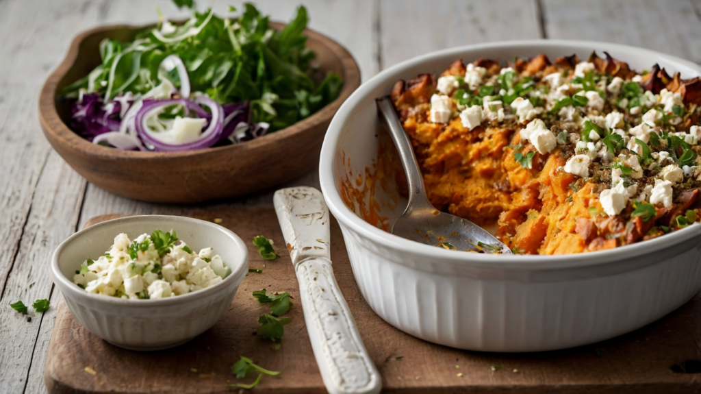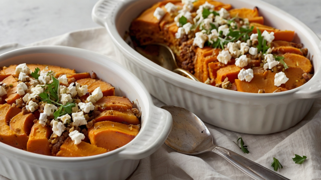 Süßkartoffeln liefern wertvolle Ballaststoffe, Beta-Carotin und Mineralstoffe. In Kombination mit proteinreichem Hackfleisch und würzigem Feta wird dieser Auflauf besonders nahrhaft.