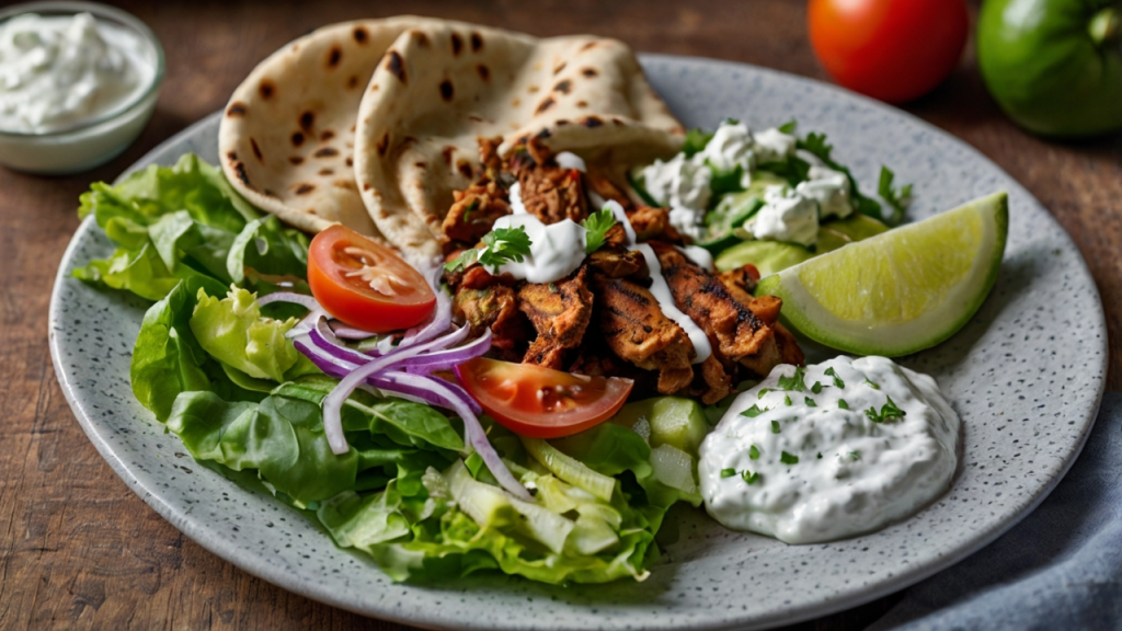 Ein knuspriges und würziges vegetarisches Gyros aus Sojaschnetzel, serviert mit cremigem Tzatziki, frischem Blattsalat und duftendem Reis. Perfekt für alle, die ein leckeres, pflanzliches Gyros genießen möchten!