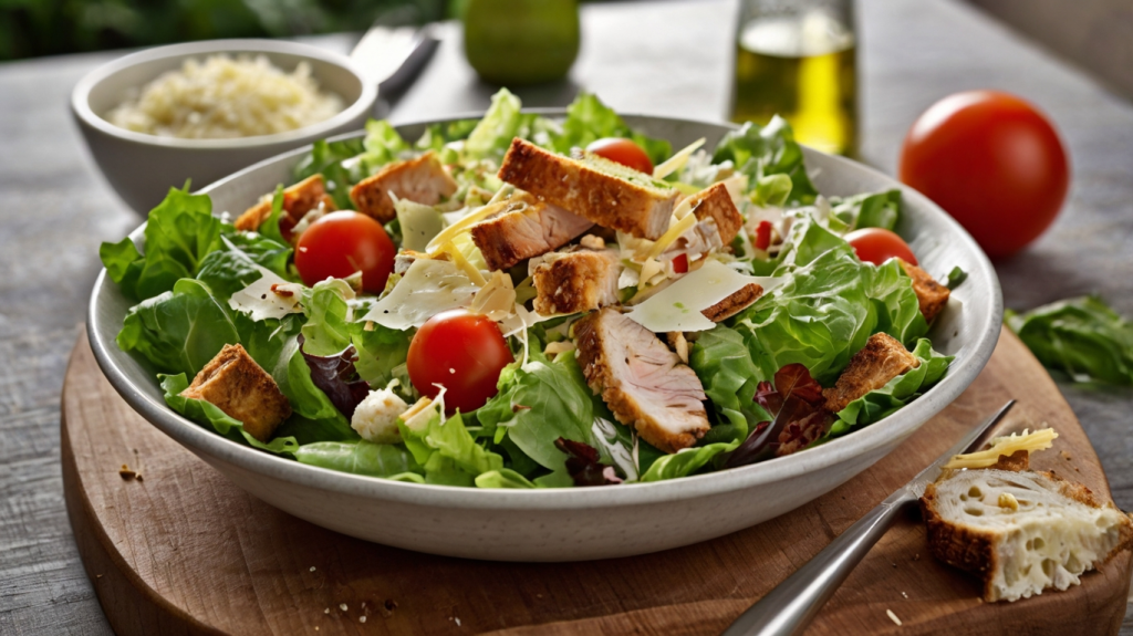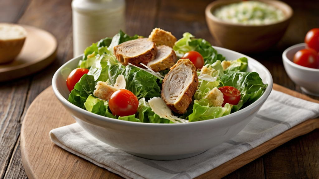 Dieser Caesar Salad ist eine leichtere Variante des Klassikers. Das Dressing auf Joghurt-Basis spart Kalorien, während das Hähnchen eine gute Proteinquelle ist.