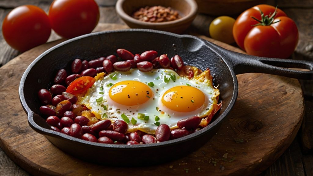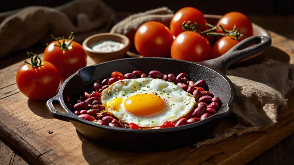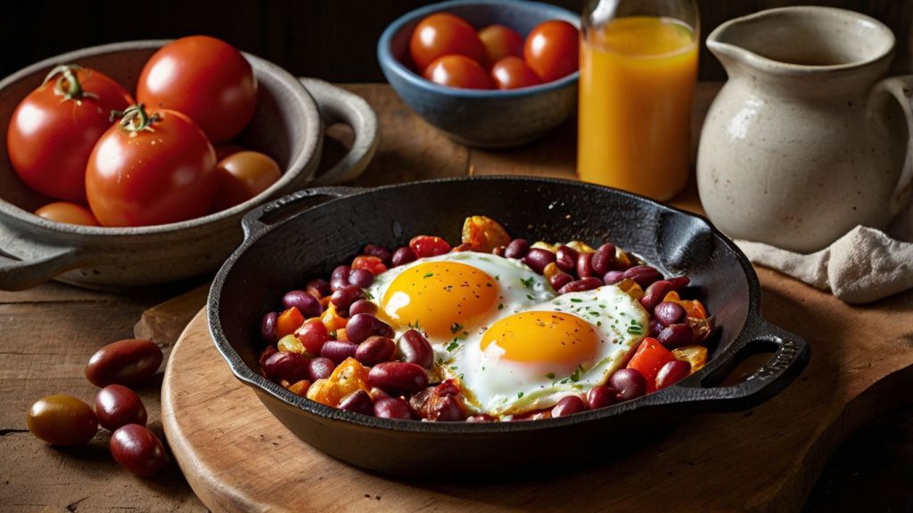 Ein herzhaftes, mediterran inspiriertes Gericht, das mit seinen frischen Zutaten und einer perfekten Balance aus Geschmack und Nährstoffen überzeugt. Die Kombination aus saftigen Tomaten, aromatischen Gewürzen und proteinreichen Eiern macht diese Pfanne zu einem Highlight für Genießer und alle, die eine ausgewogene Mahlzeit lieben. Einfach zubereitet und ein echter Genuss für den Alltag!