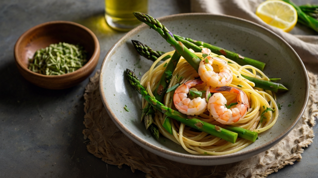 Frische Spaghetti mit grünem Spargel und Garnelen – eine perfekte Kombination für ein schnelles und gesundes Mittagessen. Die feine Zitronennote und das Basilikum verleihen dem Gericht eine herrliche Frische.