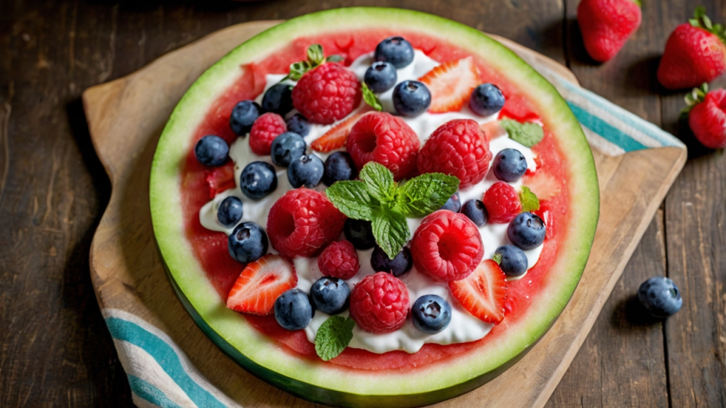 Eine erfrischende und kreative Idee für heiße Sommertage: Die Wassermelonen-Pizza kombiniert saftige Frucht, cremigen Frischkäse und knackige Toppings zu einem gesunden Genuss!