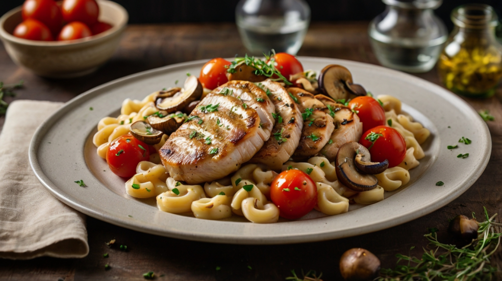 Zarte Putenmedaillons mit cremigen Champignons, frischen Tomaten und Spätzle – in nur 30 Minuten auf dem Tisch! Perfekt für ein schnelles und proteinreiches Mittagessen.