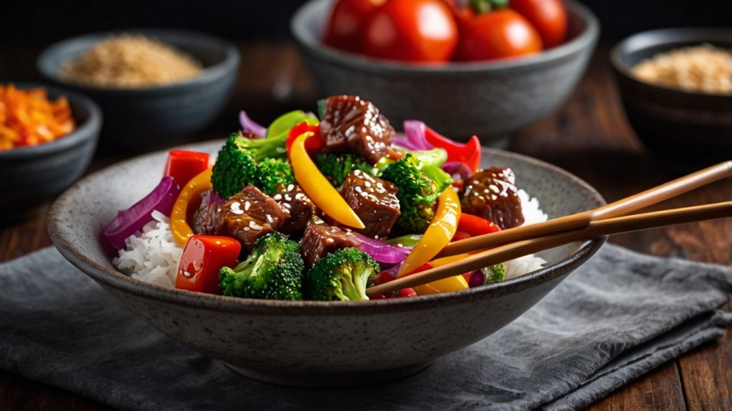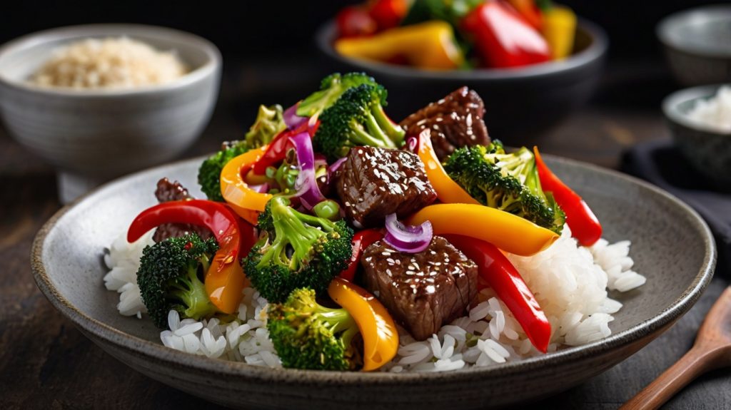 Dieses asiatisch inspirierte Rindfleischgericht kombiniert zartes Rindersteak mit knackigem Gemüse in einer würzigen Sauce. Verfeinert mit Sojasauce, Sambal Oelek und geröstetem Sesam, ist es die perfekte Mischung aus Geschmack und Nährwert. Ein Highlight für alle, die schnelle und ausgewogene Mahlzeiten lieben!